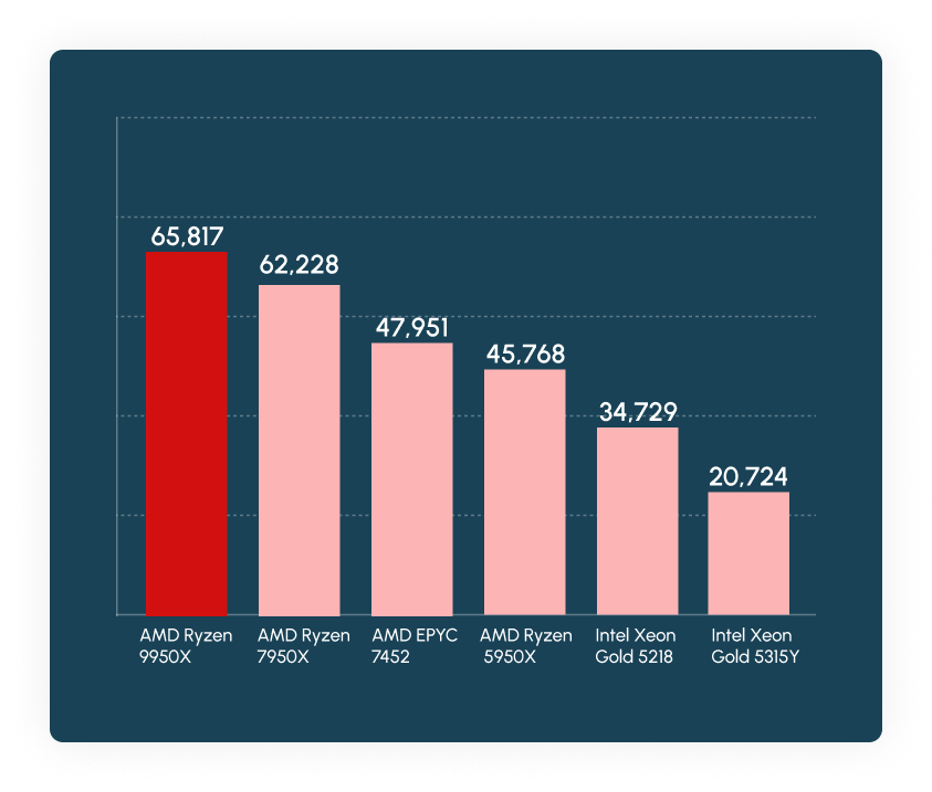 This high-caliber single-threading advantage is what sets our Alpha Series apart in the trading industry. While competitors may utilize CPUs like the 5900X or various Intel Xeons, these fall short in single-threaded tasks where the 9950X excels. Our Alpha-Series VPS, powered by the AMD Ryzen 9 9950X, tops the chart with a 4,729 single-threaded Passmark score, essential for trading platforms like NinjaTrader 8 that rely on fast single-threaded performance.