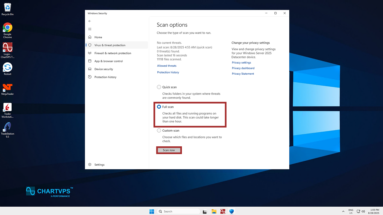 From these options, go ahead and select Full Scan. Then click Scan Now. This will perform a rigorous full scan and alert you to any problematic programs or threats that it finds. It may take a little while since it’s scanning everything, so feel free to kick back while you wait.