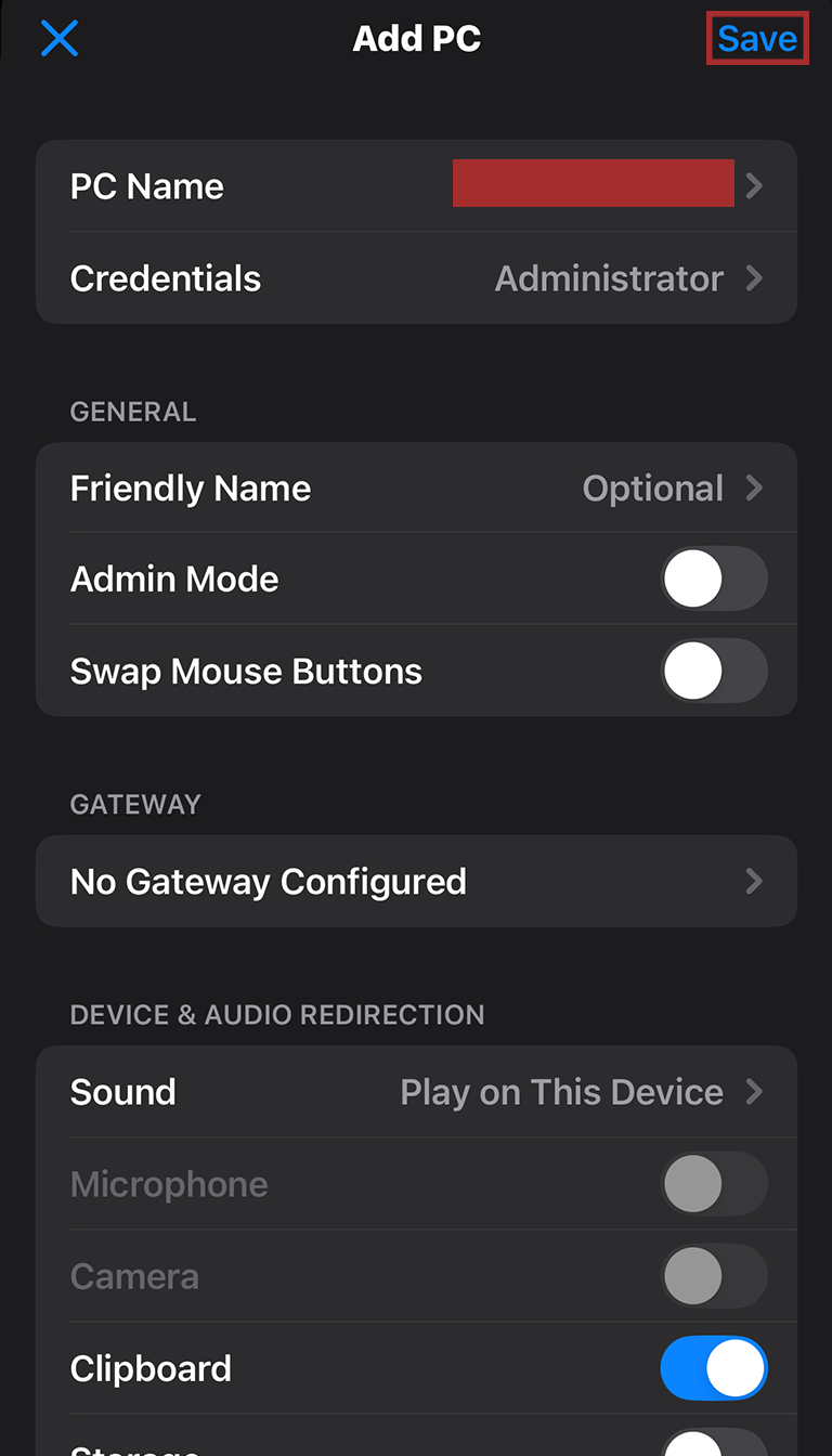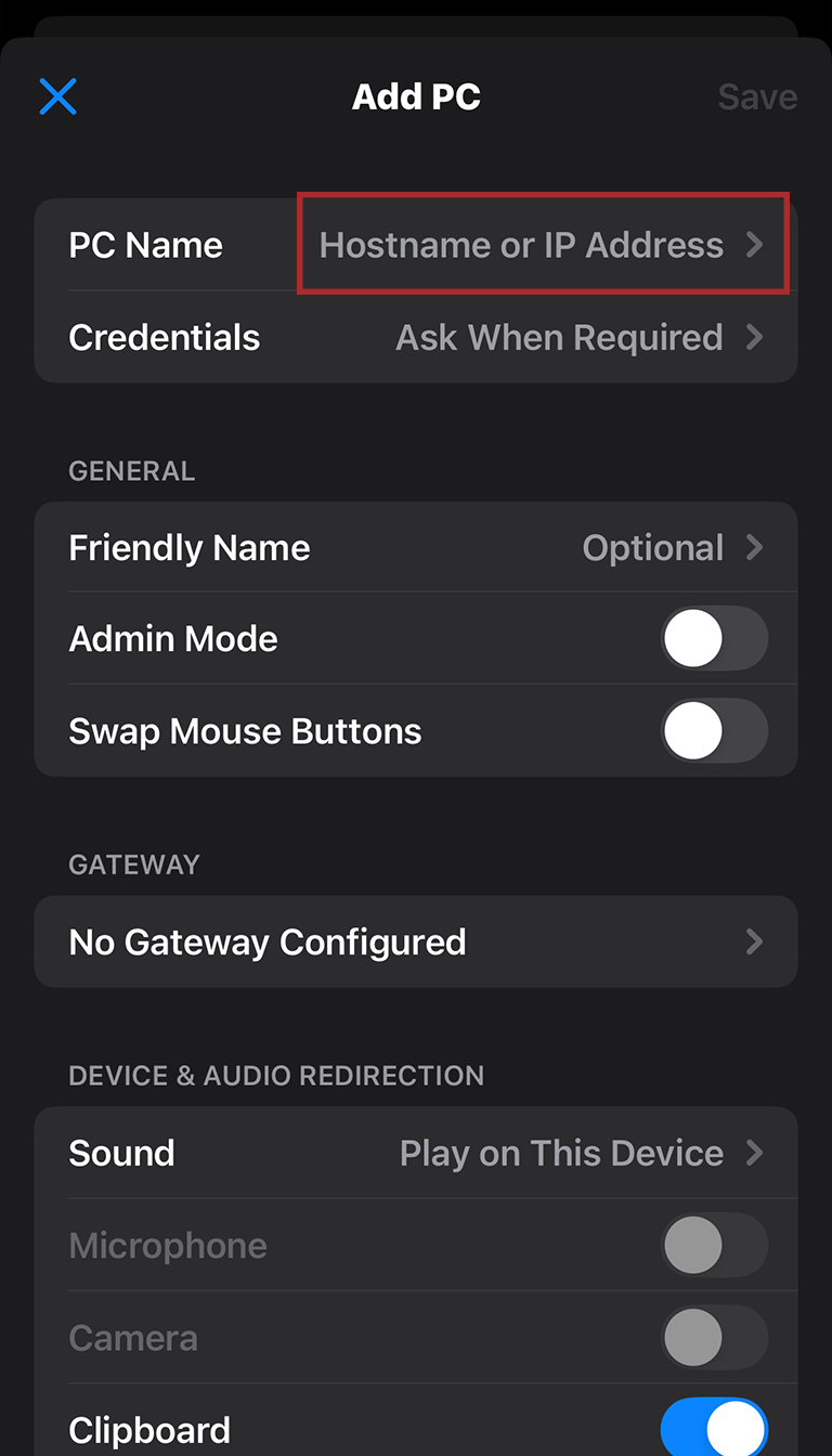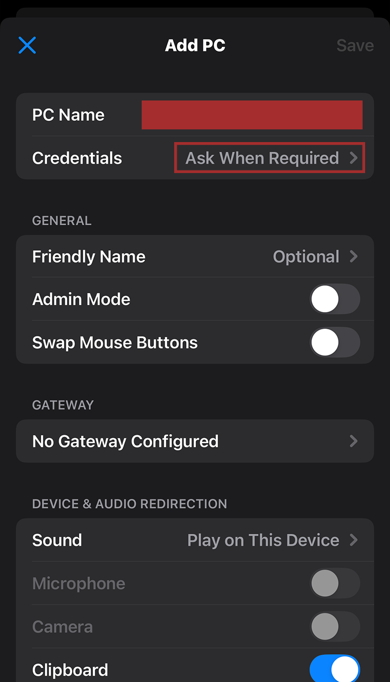 With that, you’ve reached the main configuration screen! You’ll be typing info into the PC Name and Credentials fields, so let’s start by tapping on PC Name.