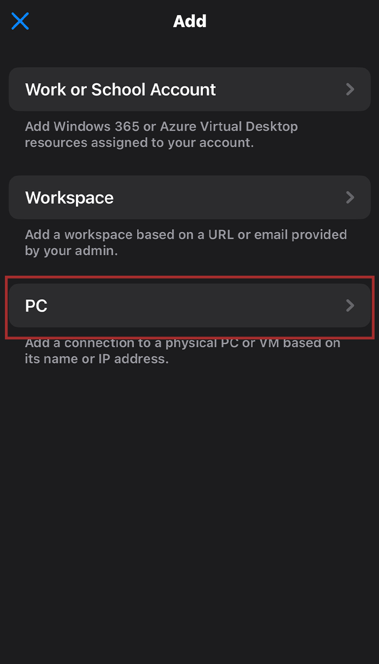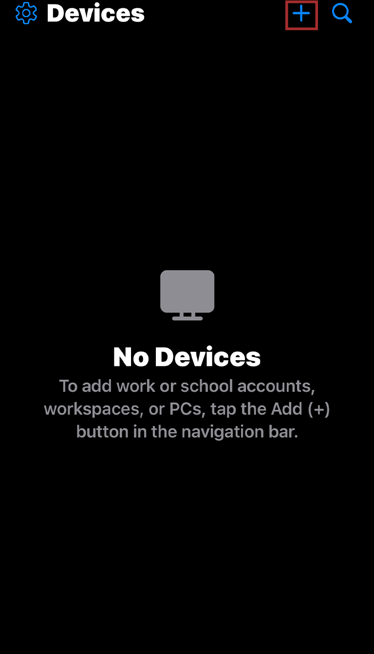 Next, launch Windows App Mobile. Once it’s open, tap on the + in the top-right corner of the app. Then, select PC.