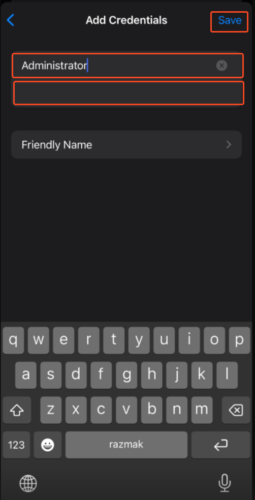 Enter the Username (for example, Administrator) and Password we sent you via email into the first and second fields, respectively, and tap Save