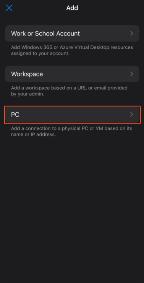 Launch the app, then tap the + in the top-right corner and select Add PC