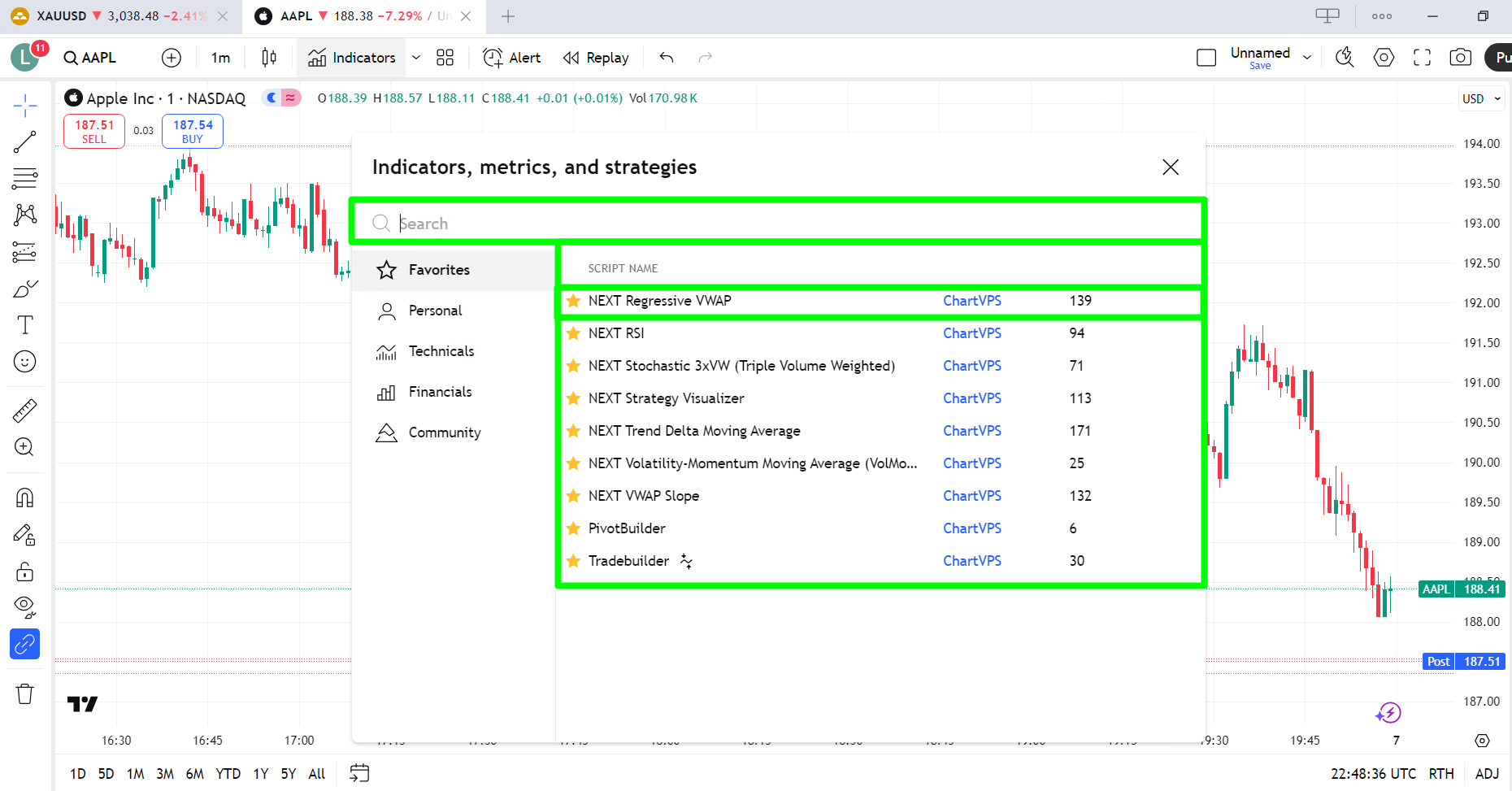 You will then have an option to search for pre-built indicators or you can use the one you added, just like we used ChartVPS NEXT Indicators here: