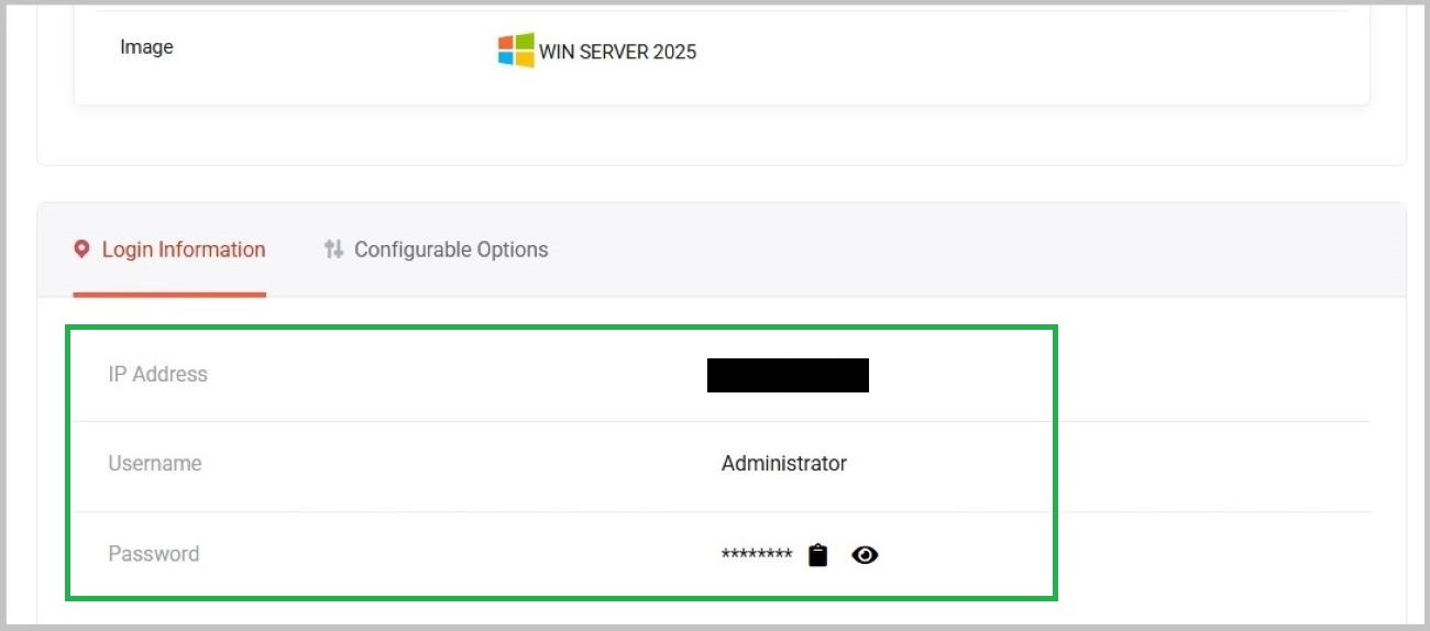 Next, you will be directed to your active server details page and, once there, just scroll to the bottom of the page to see your Login Information. Blink the “eye” to display the password.