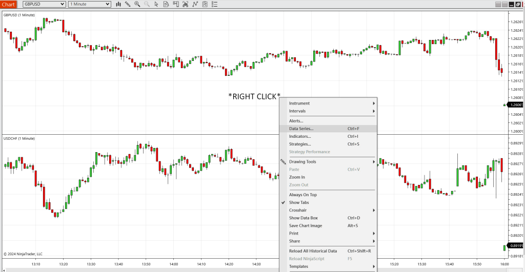 1. First you open your NinjaTrader app. Start with the RIGHT CLICK on the panel and go to DATA SERIES: