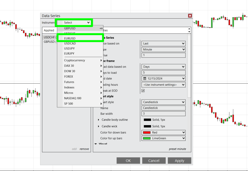 2. Once you’re in DATA SERIES, you should pick an instrument you’d like to add on the top of the little window (In our case GBPCAD)