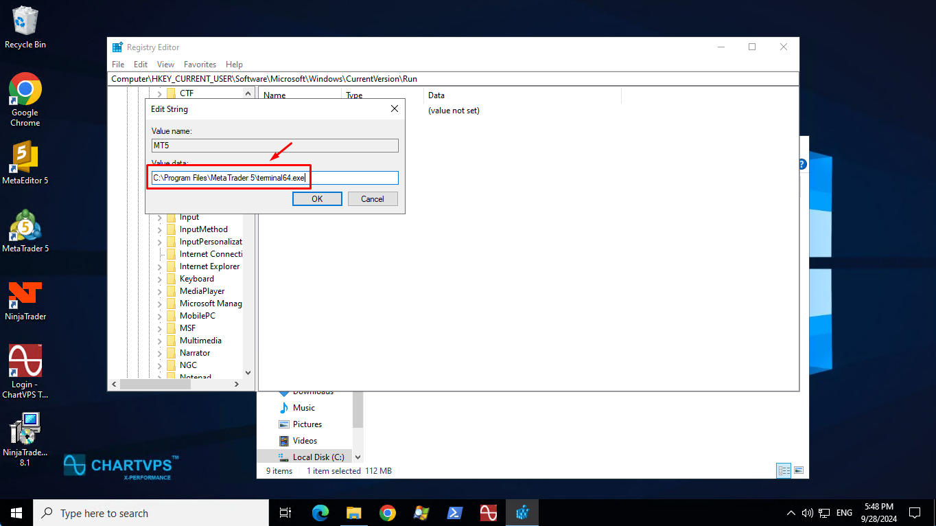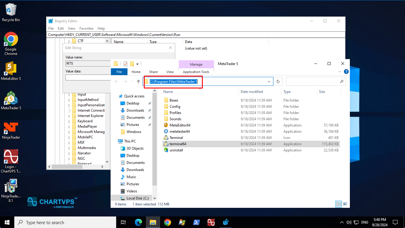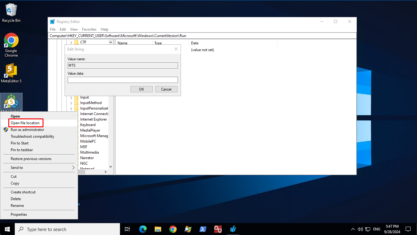 To find the exact path, right-click the shortcut icon on your desktop and select Open file location. Copy the link from the address bar, paste it in "Value data," and add \terminal64.exe at the end.