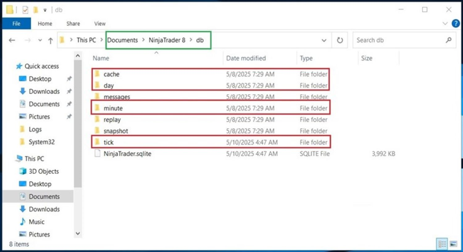 - Navigate to the Documents/NinjaTrader 8/db folder to access the cache.