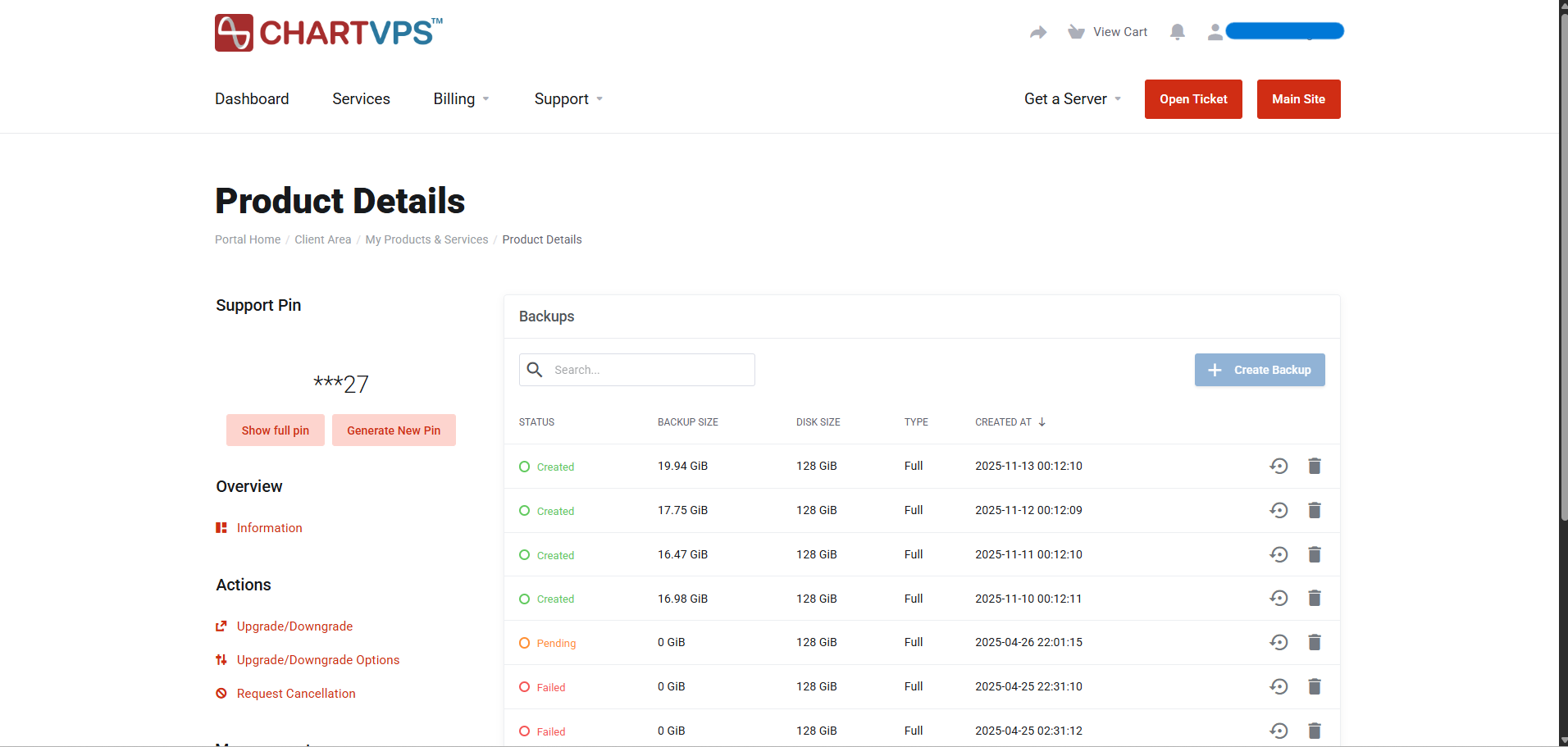 Server Backup Management Dashboard – The Server Backup Management Dashboard provides an overview of recent full backups for your server. Each entry displays key details including the backup status, backup size, disk size, backup type, and creation date.