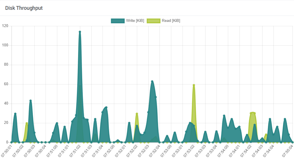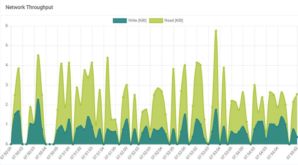 Network Throughput – The Network Throughput graph tracks data transmission rates over time, showing how much information the system sends and receives. Monitoring this metric helps detect network congestion, bandwidth saturation, or unusual traffic patterns that could affect connectivity and overall responsiveness.