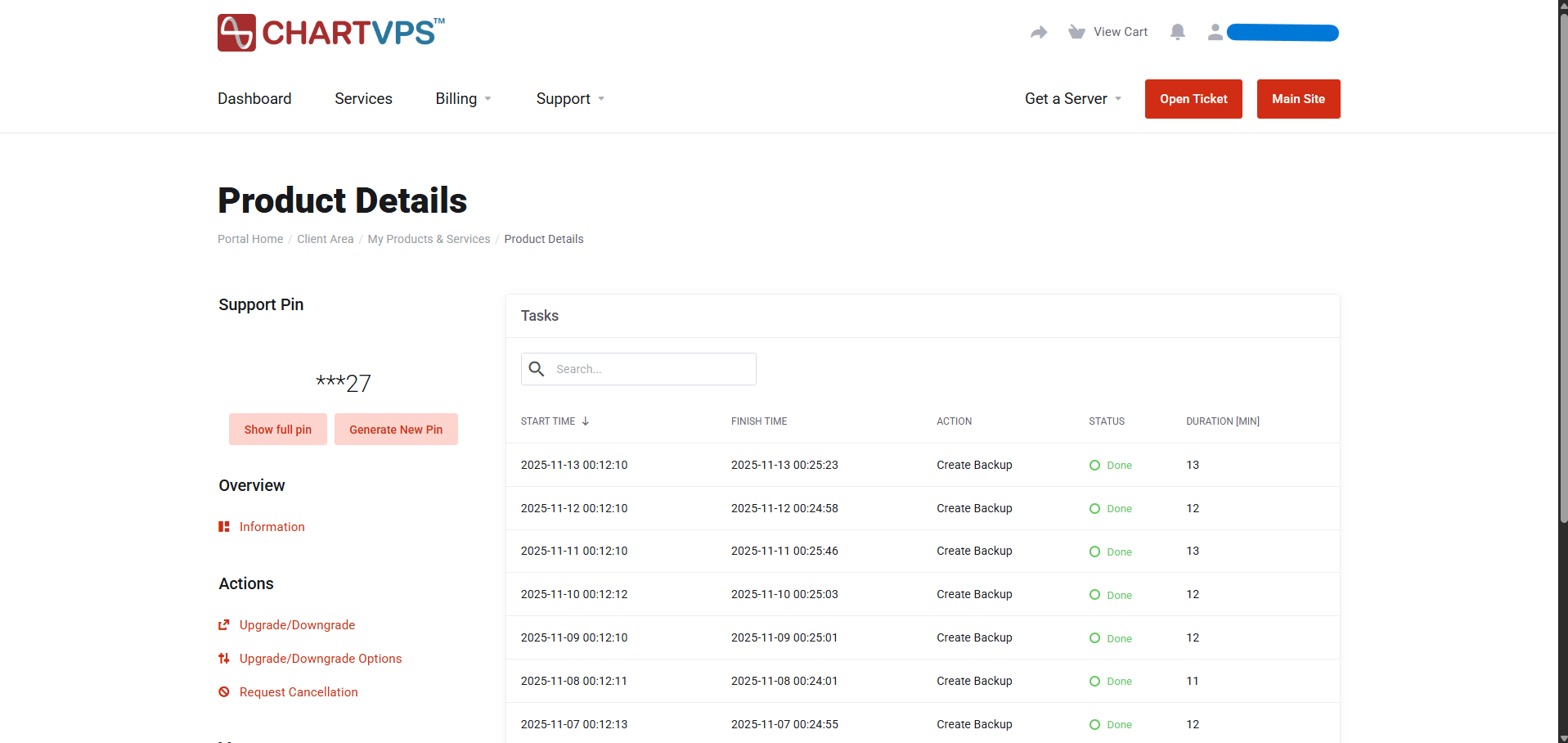 Task Logs – Task Logs provide a detailed history of all important actions performed on the server. This includes activities such as starting, stopping, or restarting the server, entering rescue mode, performing backups, restoring data, and other background operations. By reviewing these logs, you can see exactly what actions have been taken, when they occurred, and whether they were completed successfully. Task Logs are a valuable tool for monitoring server activity, troubleshooting issues, verifying backup and restoration tasks, and ensuring the server is running smoothly. They make it easy to track changes and maintain transparency in server management, giving administrators and users confidence in the system’s reliability.