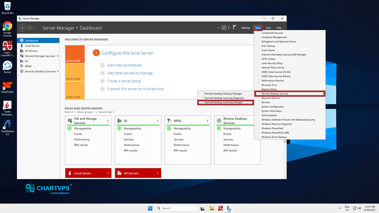 At the top left, hit Tools, then Remote Desktop Services, and Remote Desktop Licensing Manager.