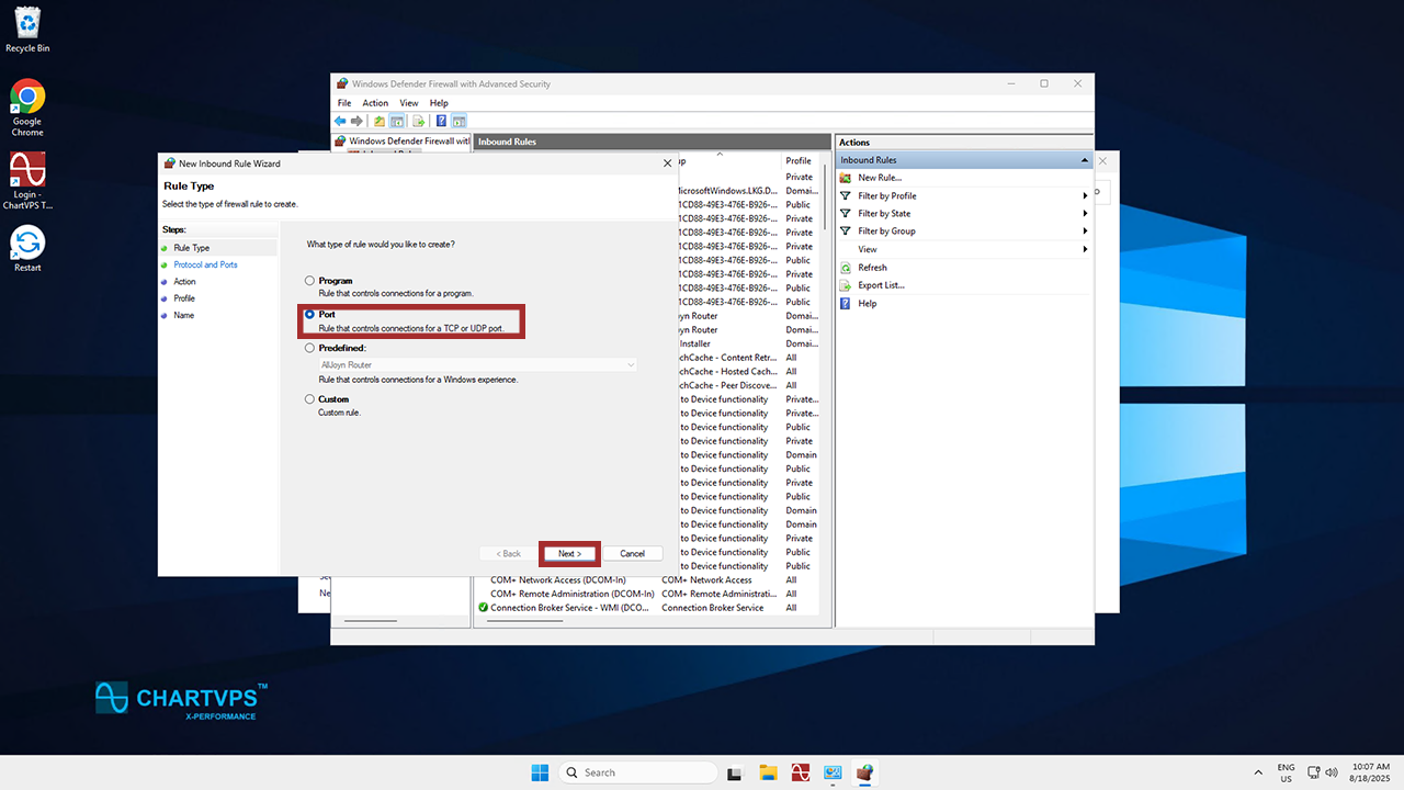 In the Rule Type section, you’ll want to select Port, then click Next.