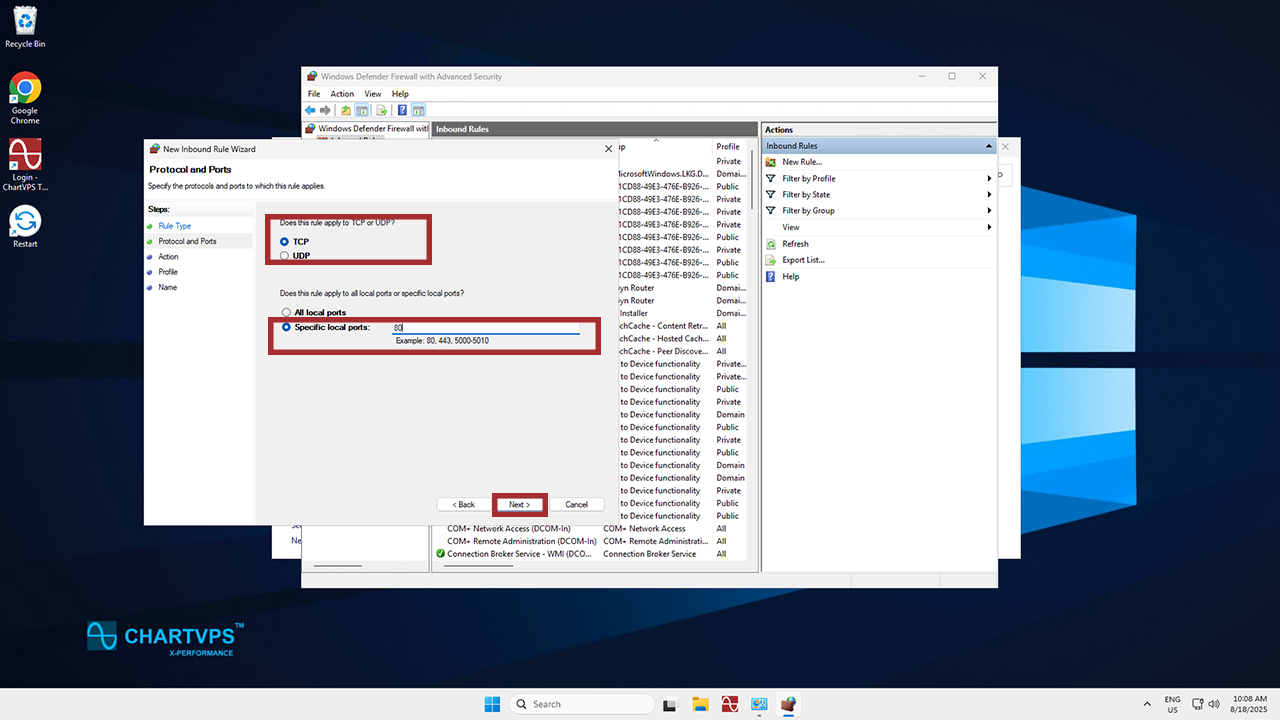 Now we’re on the Protocol and Ports screen. Here, you can pick your Port type (in our example, we’ll use TCP) as well as enter the number of the Port you want to add. In our screenshot, it’s Port 80. We’re using Port 80 to make sure the website or application hosted on a server is accessible to Users. Finally, click Next.