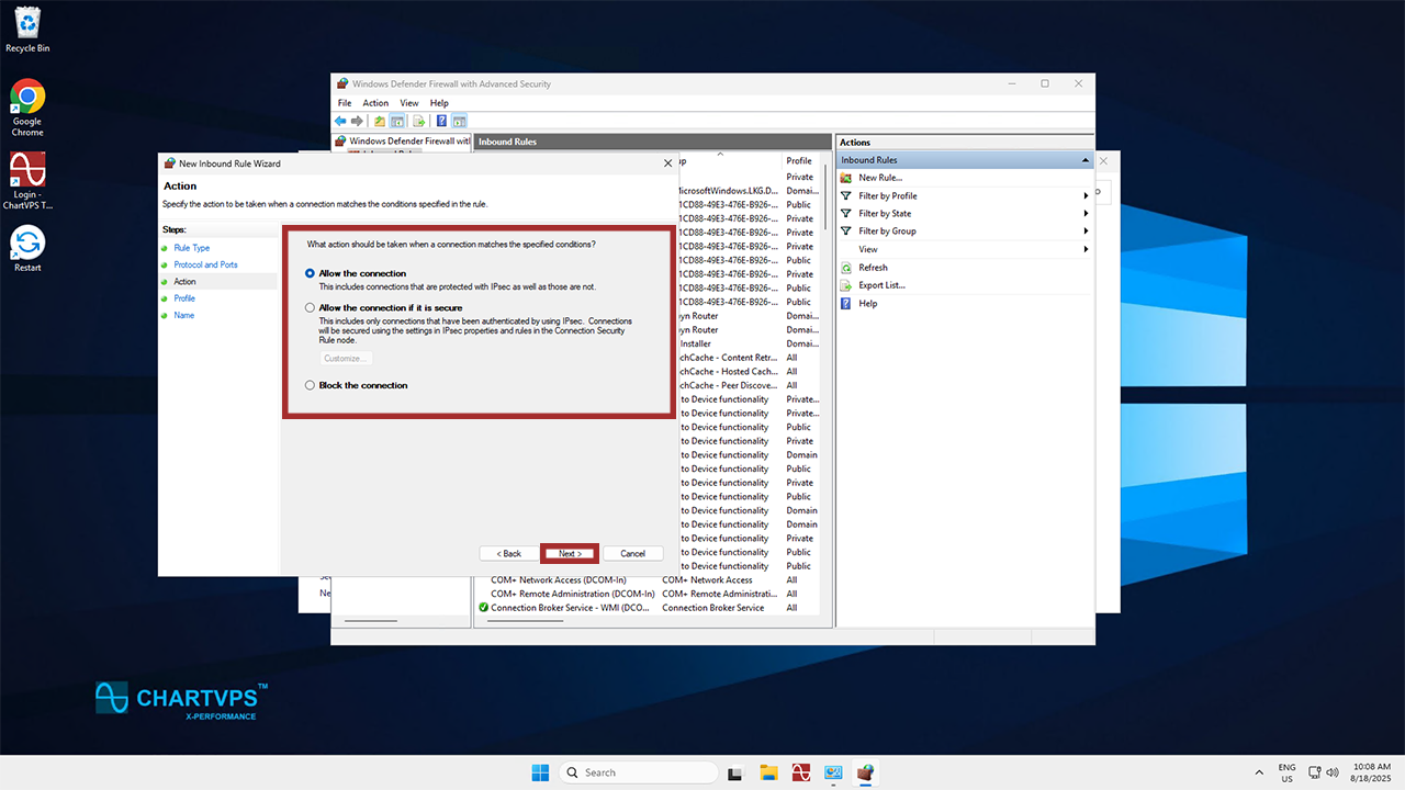 Time for the Action screen! Select Allow the Connection, and once more, hit Next.