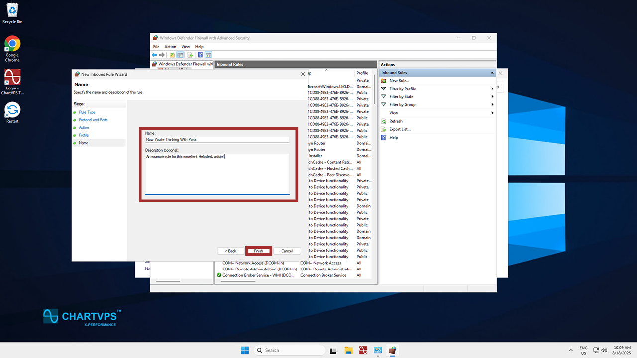 This is where you can get a bit creative. Give the rule a name and a description so you can tell what it does, and close things out by hitting Finish. With that, you’ve allowed your chosen port!