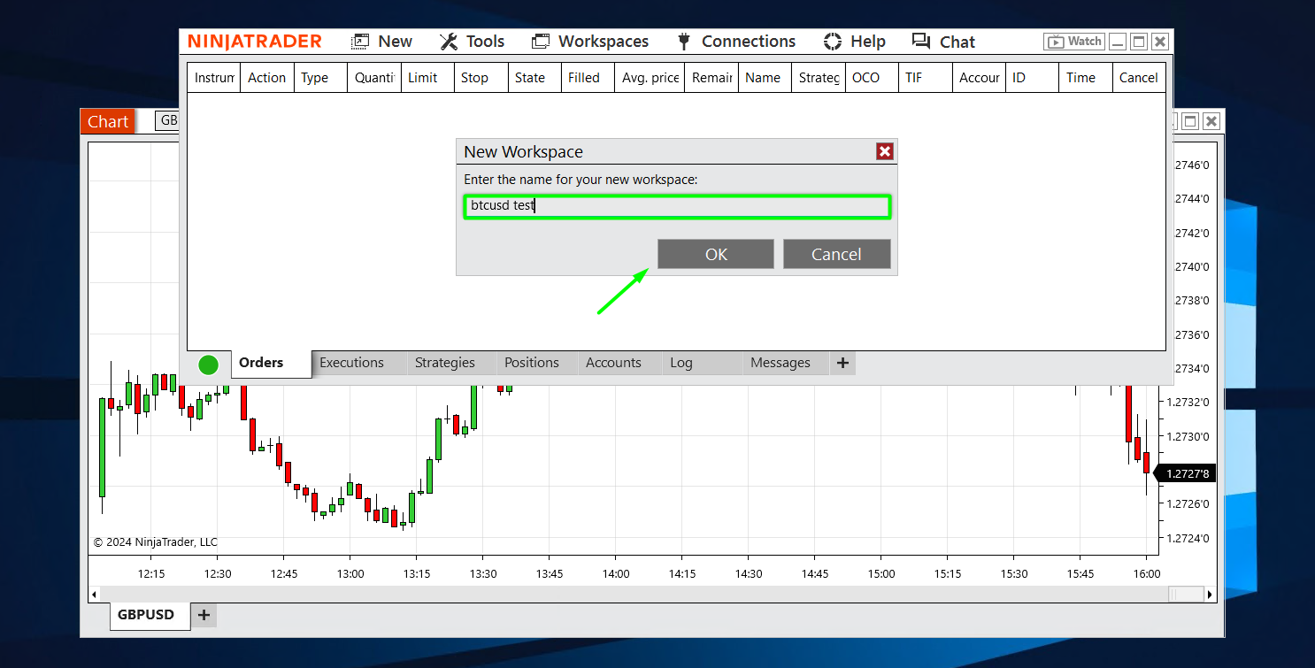 Then you’d have an option to name it. Make sure you name it after something you can easily remember connected to the workspace like we named it "BTCUSD", so you can access it next time you open your NinjaTrader App: