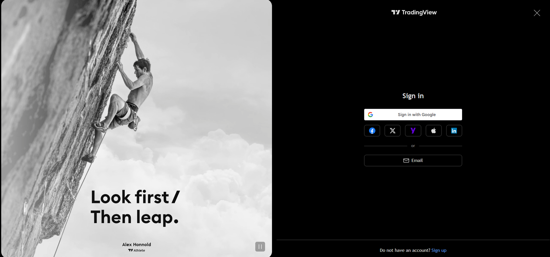 - First things first – you’ve got to either create or log in to your TradingView account using one of the options given, such as a Google or Facebook account. If you don’t have a TradingView account, clicking the Sign Up button at the bottom of the window will simply switch the sign-in prompt to a sign-up prompt on the same page – nice and easy!