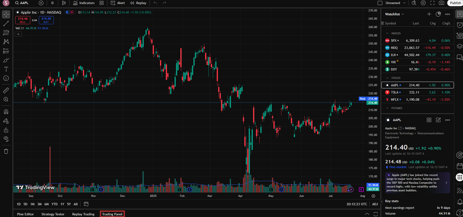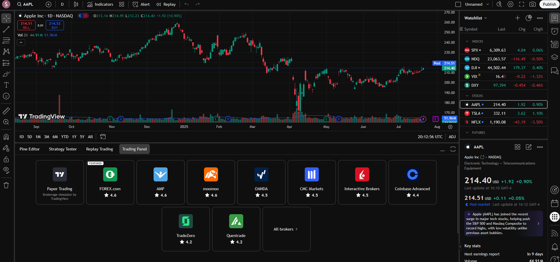 After picking your market, click on Trading Panel in the bottom left to connect your broker. As a heads-up, only the brokers that work inside TradingView will be shown in the Trading Panel. If you signed up with a different broker previously, there’s a chance they might not appear here.