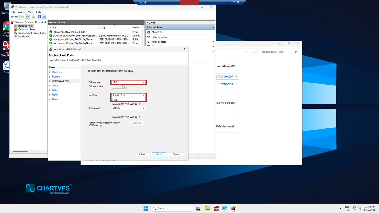 Things get a bit more complex on the Protocol and Ports page. Here, select the protocol type that you want to allow. To restrict the rule to a specified port number, youโve got to select either TCP or UDP from the Protocol Type dropdown menu. Since this is an incoming rule, you usually configure only the local port number. If you select another protocol, then only packets whose protocol field in the IP header match this rule are permitted through the firewall. If you want to select a protocol by its number, just select Custom from the list, and then type the number in the Protocol number box. When you have configured the protocols and ports, select Next.
