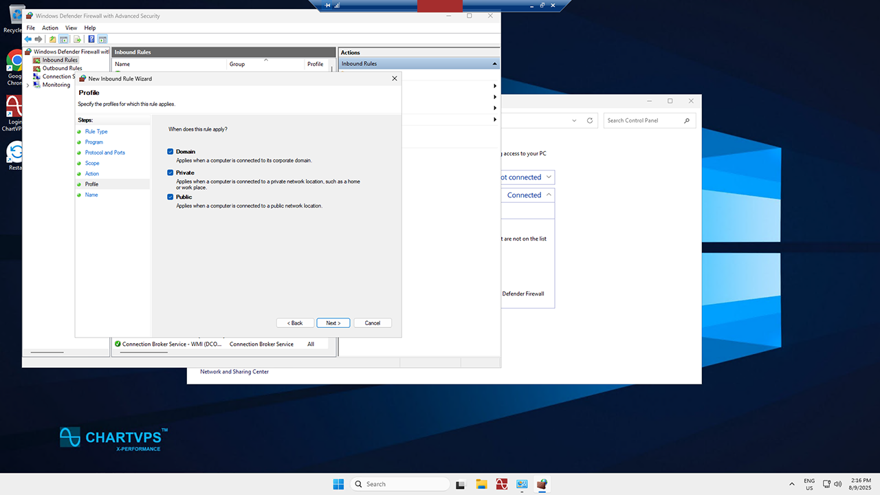 Second to last, itโs the Profile page. Pick the network location types that you want this rule to apply to, then click Next.