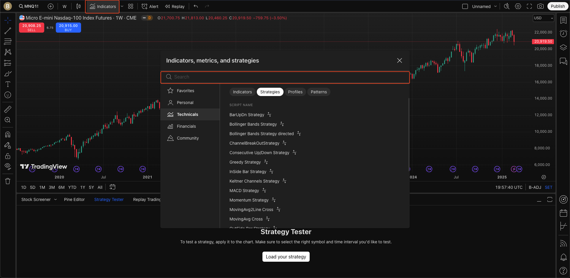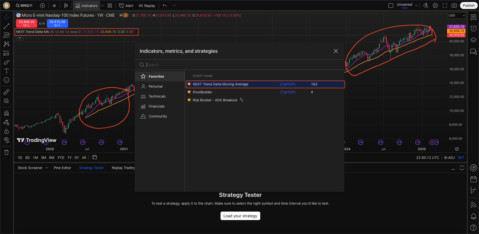 - There’s actually yet another way to find more indicators and strategies outside of receiving a direct link to them. Simply search by clicking on Indicators in the top left when on a Superchart. This opens a menu with a search bar, which you can use to search for the indicator or strategy you’re looking for. You can also click on the Favourites tab to see the NEXT algorithms that you favourited previously.