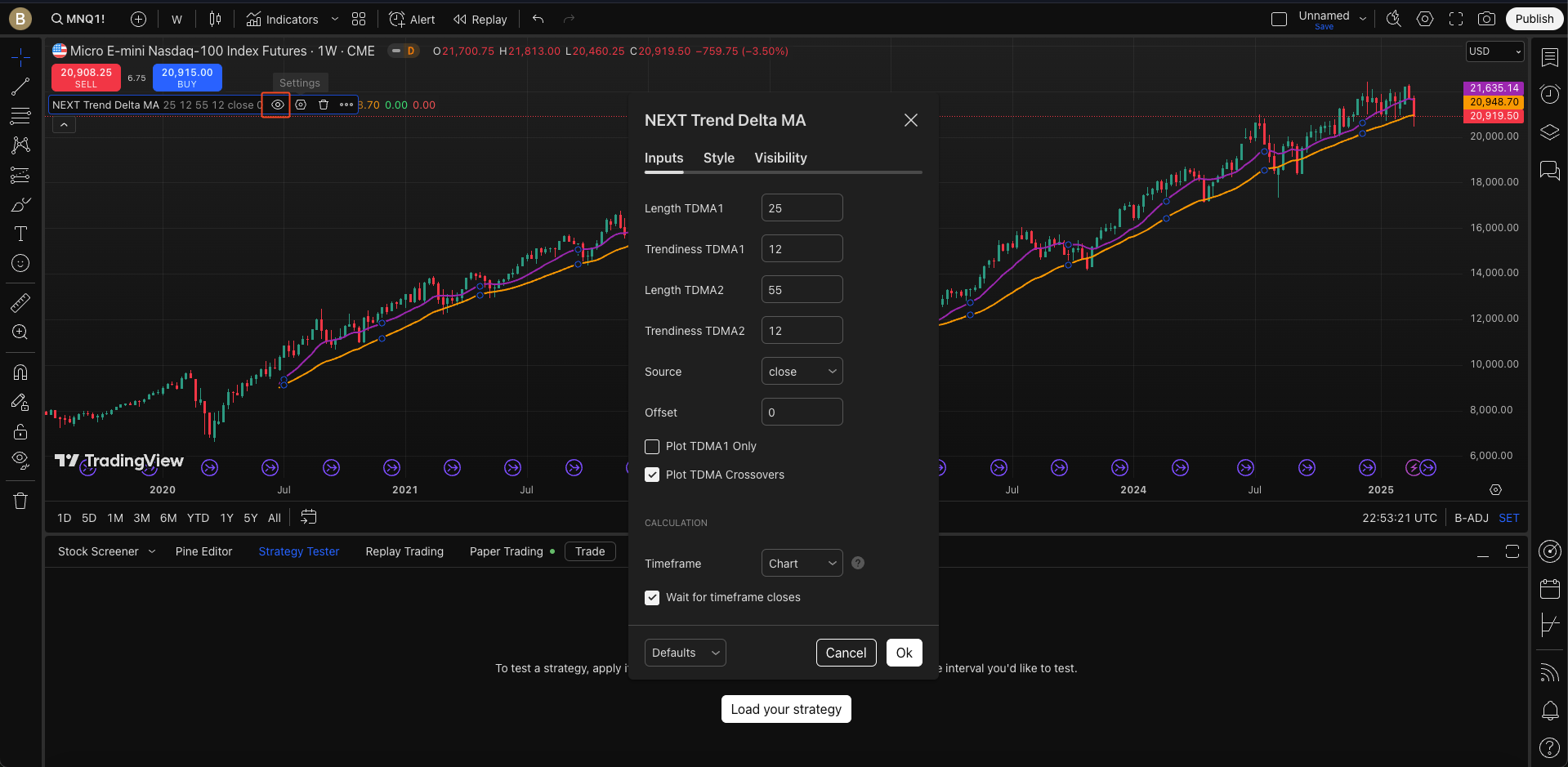 - Now we’re near the end! It’s time to make the indicators and strategies suit your exact needs. You can easily adjust and make changes to them by clicking on the nut wheel at the end of the text line that appears on the chart. You can also hide the effects of the indicator or strategy and remove it from the same menu.