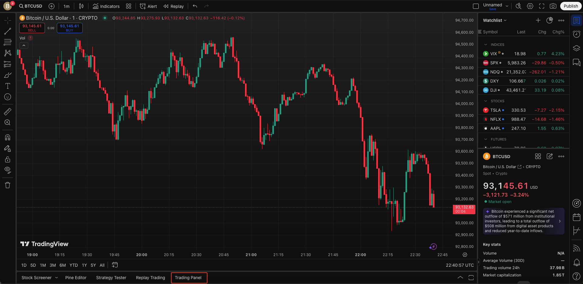 After you’ve logged into TradingView and found the Market you want to simulate trading on, you can start paper trading by clicking on Trading Panel at the bottom of the program, as you can see highlighted in the image below: