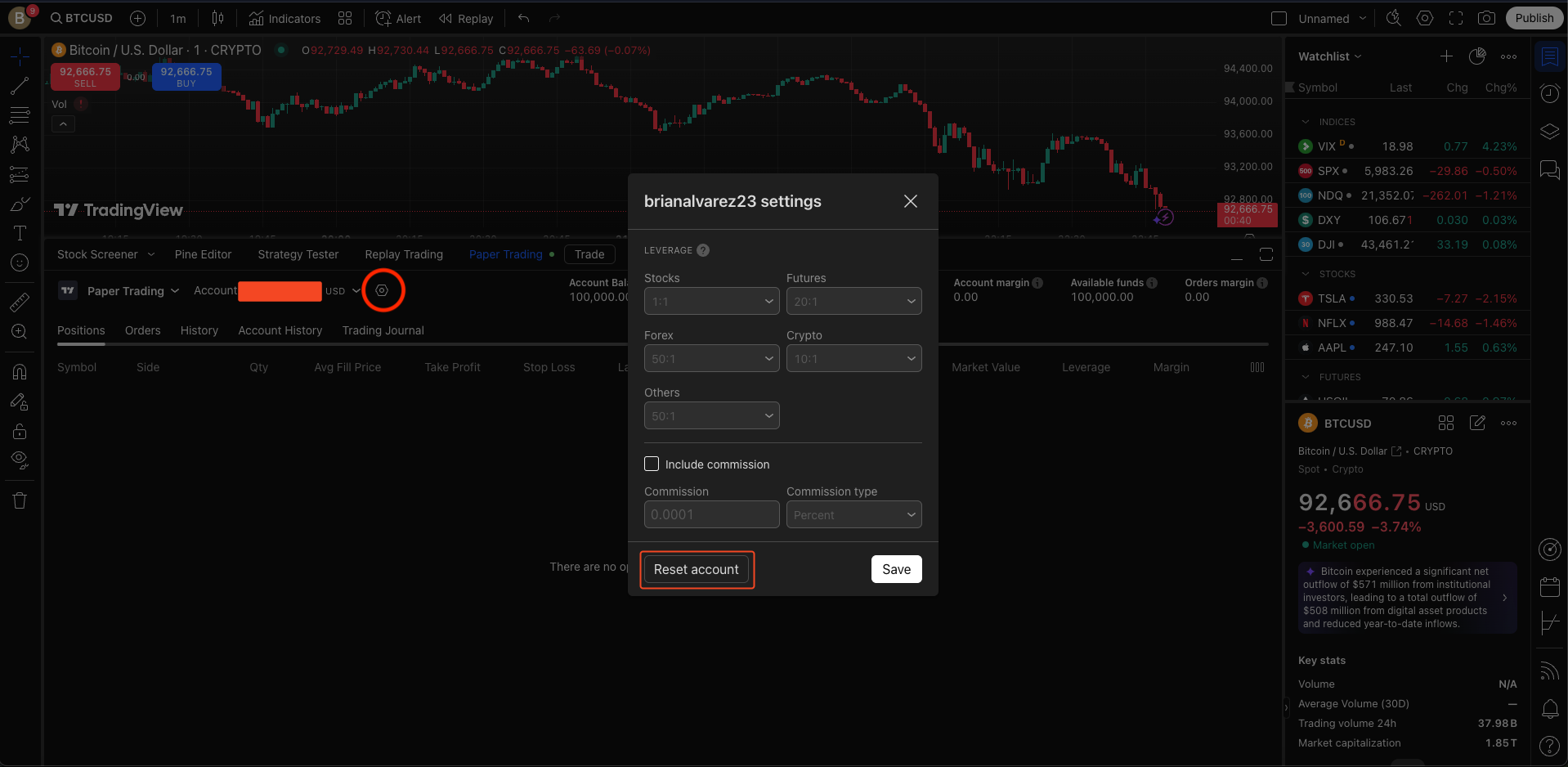 It’s worth noting that the default amount in your paper trading account is $100,000. If you want to increase or decrease this amount, all you’ve got to do is click on the little nut sitting right next to Account, followed by the Reset Account button.