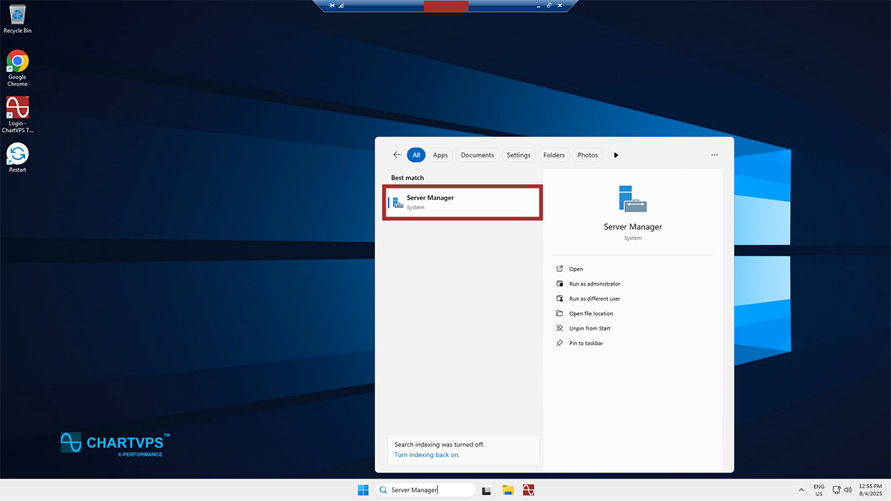 Take a deep breath – we’re about 2/3rds of the way there! Now that we’re on your server, search for Server Manager in the Start menu.