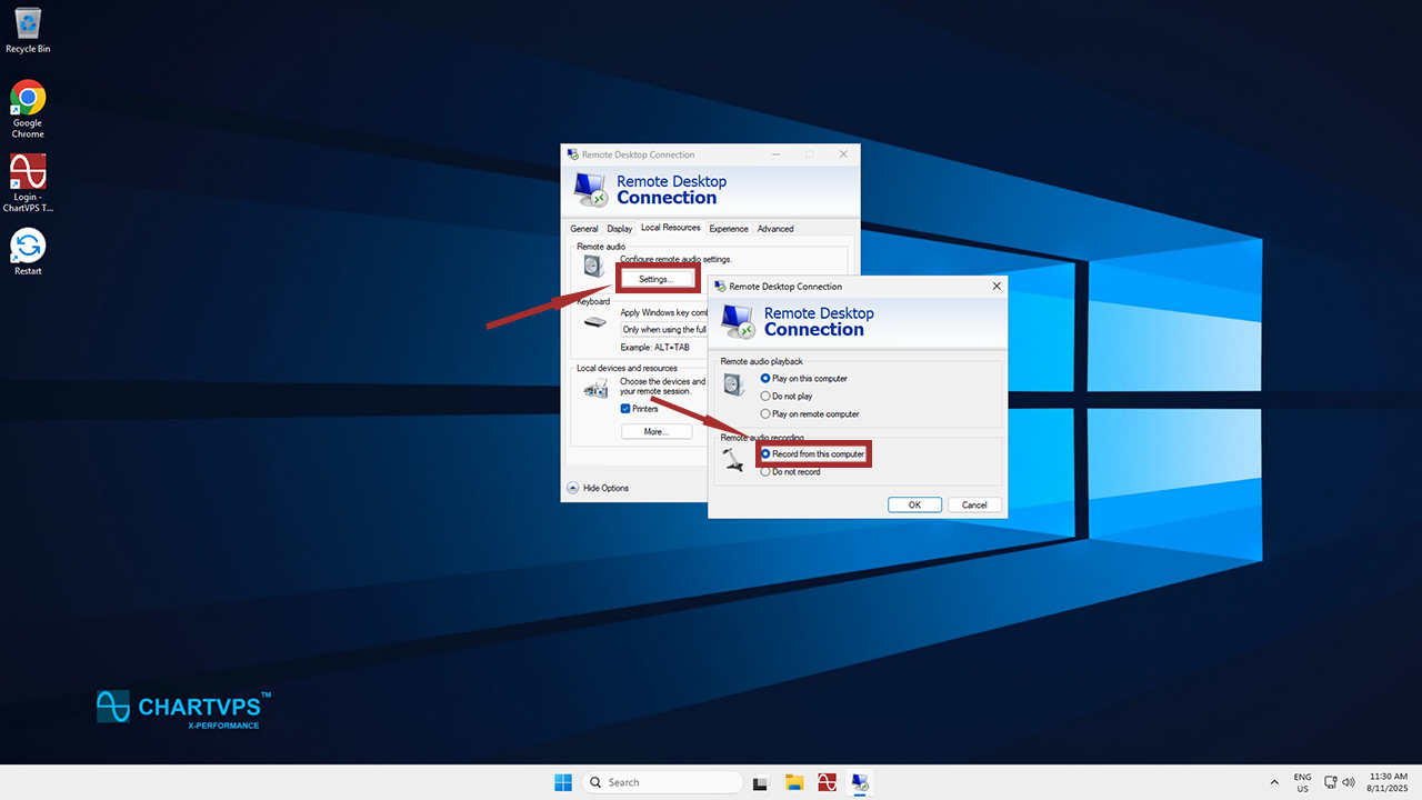 In the Settings menu, select Record from this computer under the Remote audio recording subsection. Then, hit OK to head back to the Local Resources tab.