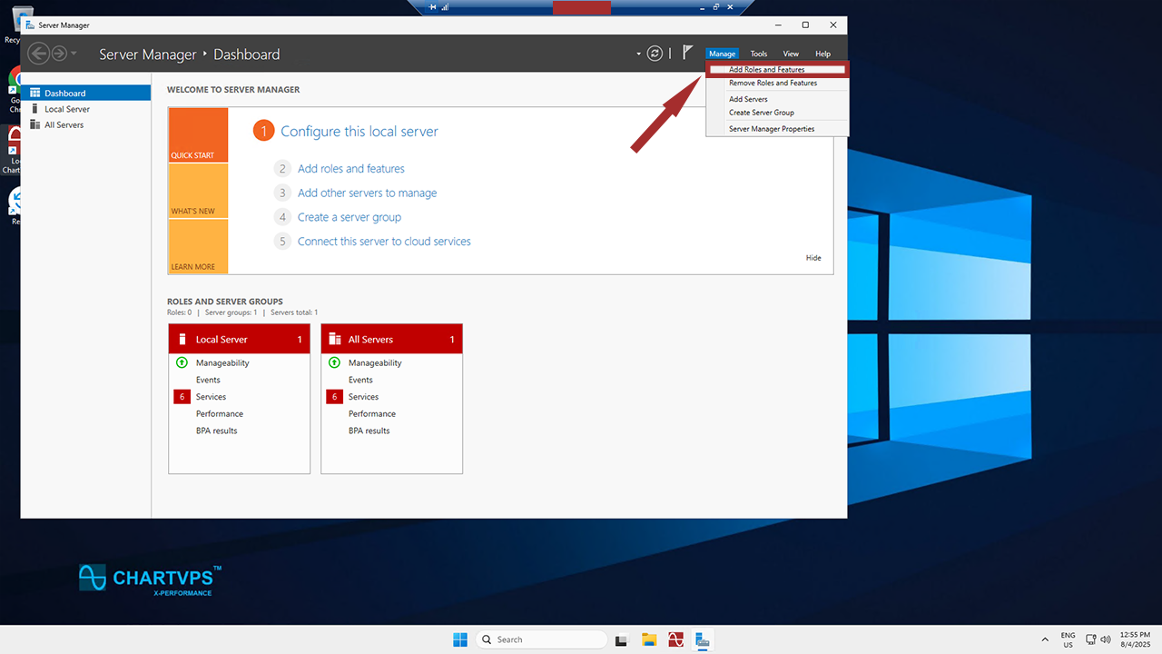 Once you’re in the Server Manager Dashboard, click on Manage, which you’ll find nestled in the upper-right corner. From the Manage menu, hit Add Roles and Features.