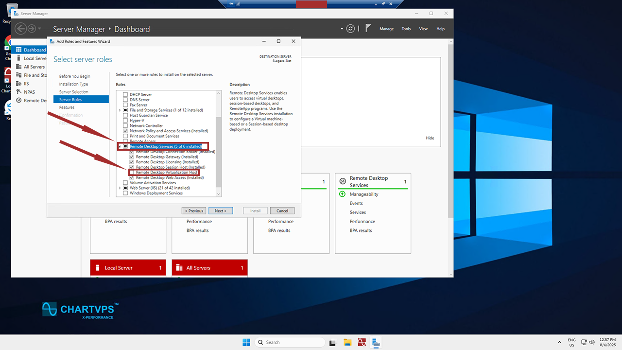 Hit Next twice more. From there, expand Remote Desktop Services under Server Roles. You’ll want to ensure all of the boxes under Remote Desktop Services are checked except for Remote Desktop Virtualization Host.