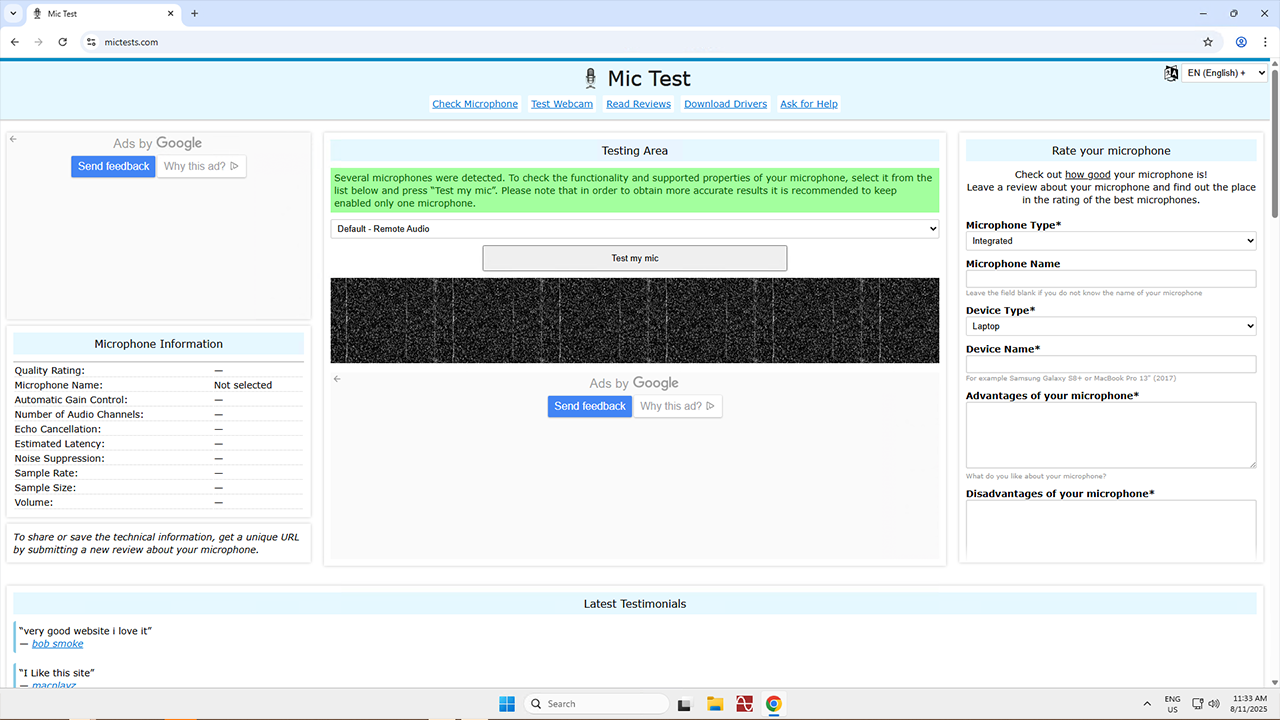 Now for the microphone! Make sure it’s working by visiting https://mictests.com/ in your web browser. Click Test My Mic and jabber away, then listen to the playback to make sure it’s all good.