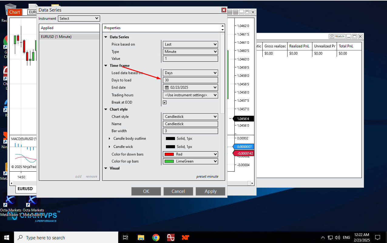 Action: To improve performance, reduce the amount of historical data loaded by adjusting the "Days to Load" parameter in the Data Series window. You can access this window quickly by pressing Ctrl+F. For example, instead of loading 365 days of data, try setting it to 30 or 60 days. By doing this, you’ll reduce the number of data points that the platform has to process, which can significantly improve chart rendering times and overall performance.