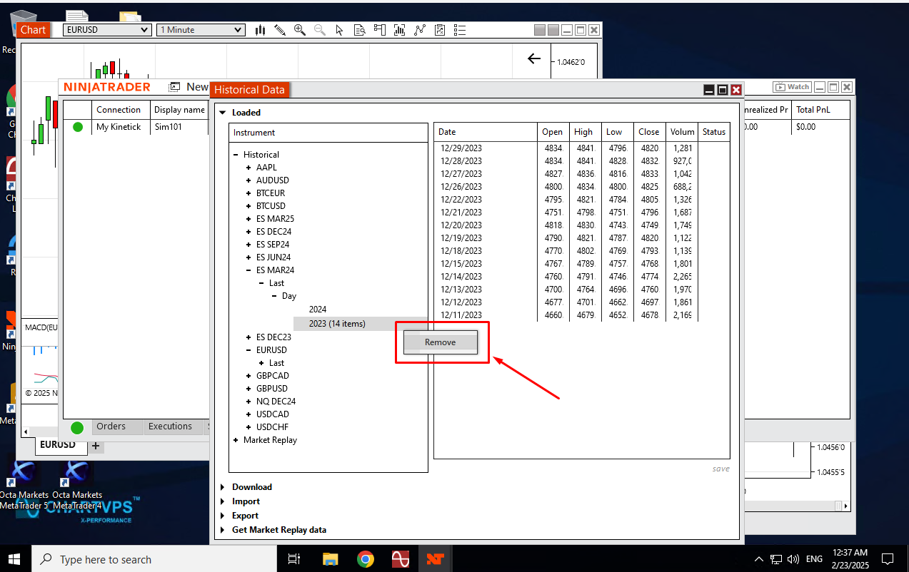 Action: To keep your platform running smoothly, clear unnecessary historical data and Sim101 account history. You can do this by going to the Tools > Historical Data > Edit menu. For instance, if you no longer need data from 2022, you can delete it to free up space and reduce the load on your system. Similarly, if your Sim101 account trade history is no longer needed, consider resetting it to avoid it from accumulating and affecting performance.