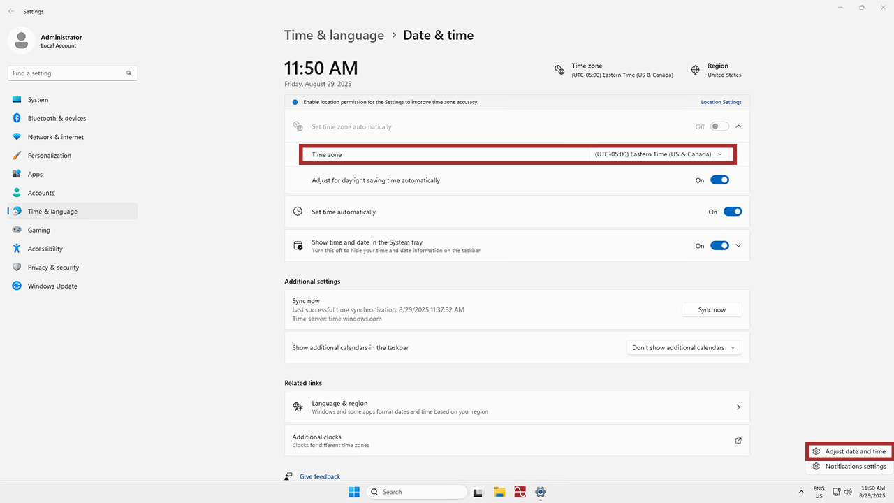 Take a look at the bottom right-hand side of the screen. Right-click on the time and select Adjust date/time. This will show you the current date, time, and timezone settings. If the timezone isn’t right, you can also adjust it from this window.