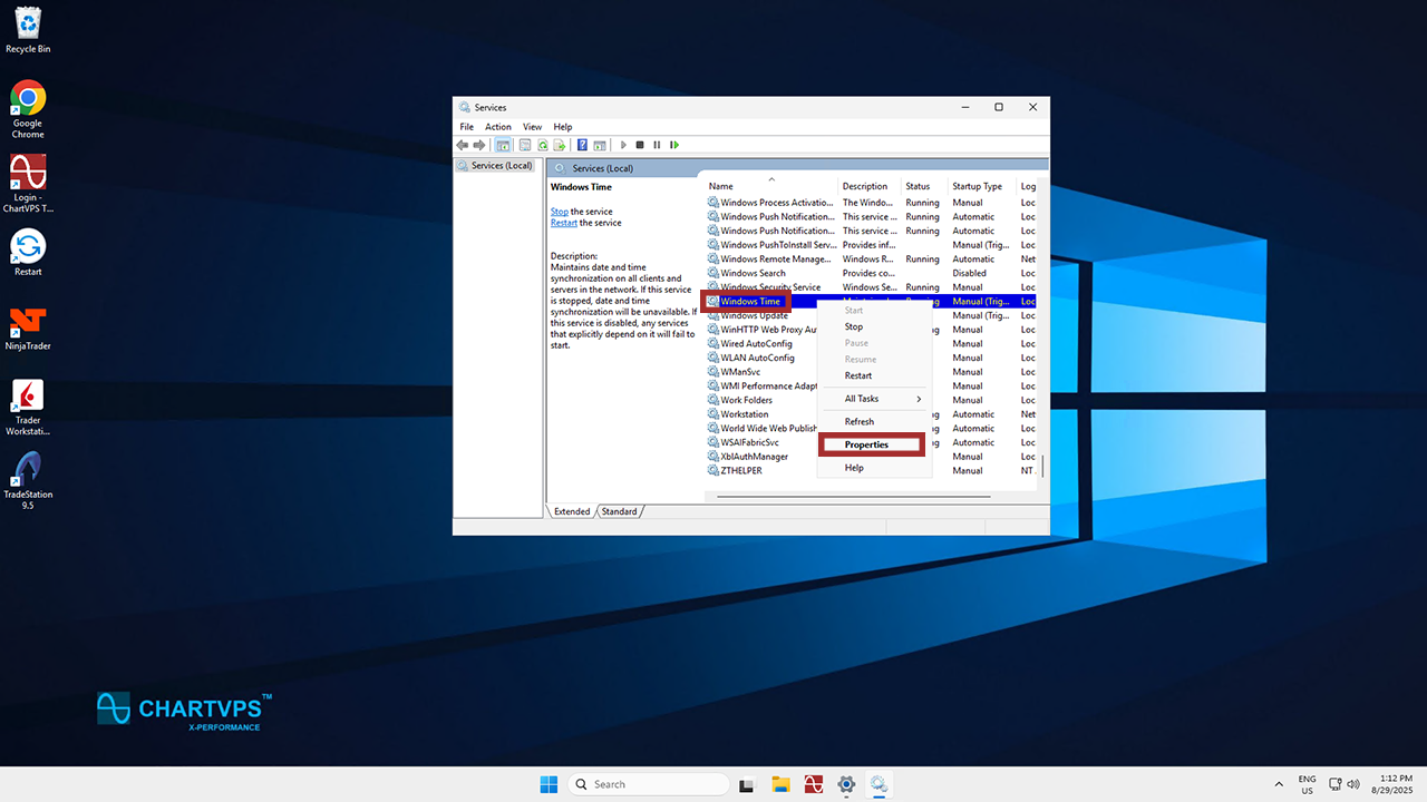 When you’ve found it, right-click on Windows Time and select Properties.