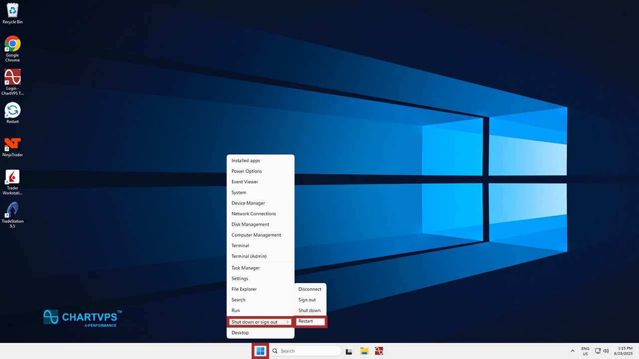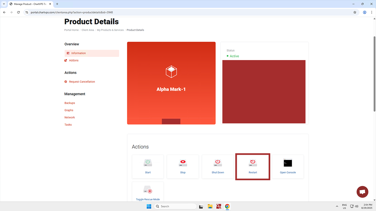 - You can also restart your server from the ChartVPS Portal. Simply log in, select your desired server, and click the Restart button!
