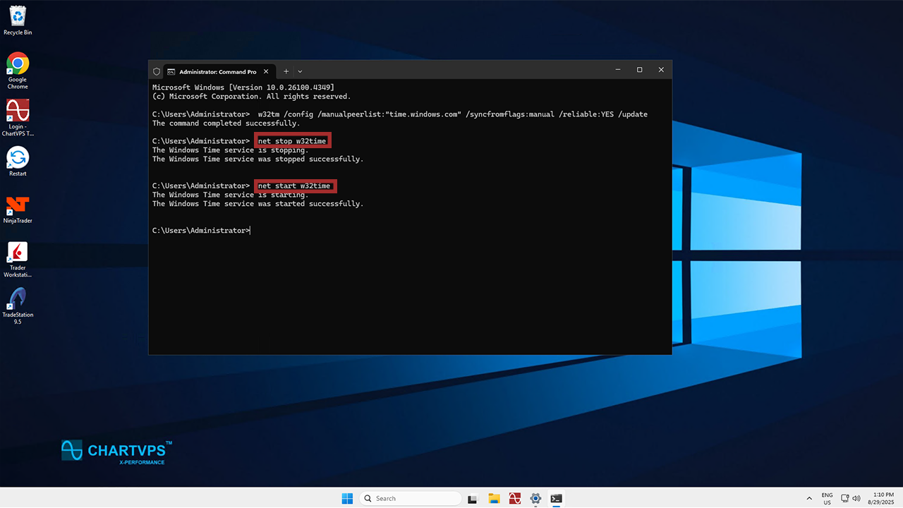 Now you just need to restart the Windows Time service to apply the changes. Toss these commands into Command Prompt and hit Enter: