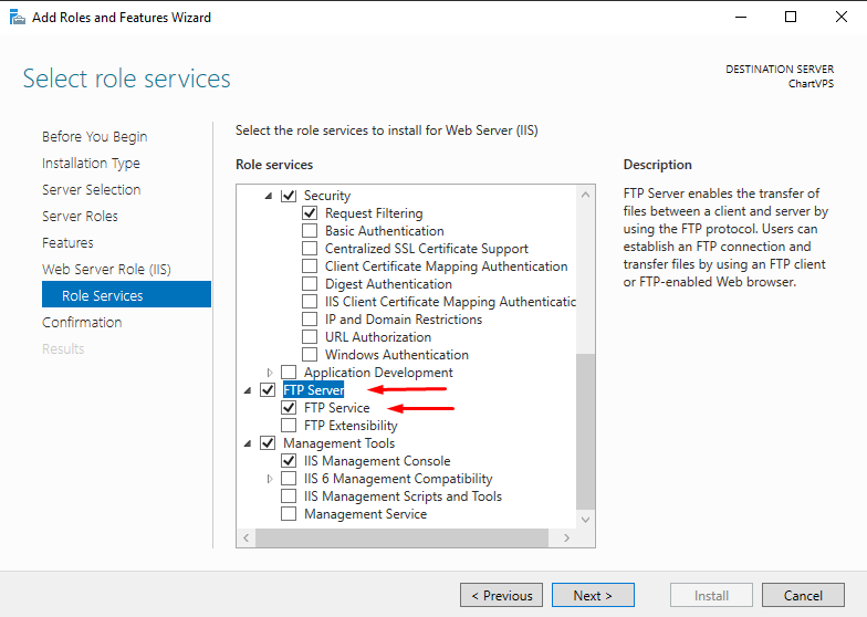 On the Role Services, scroll down and click to check the FTP Server box and make sure that the FTP Service box below FTP Server is also checked then click Next