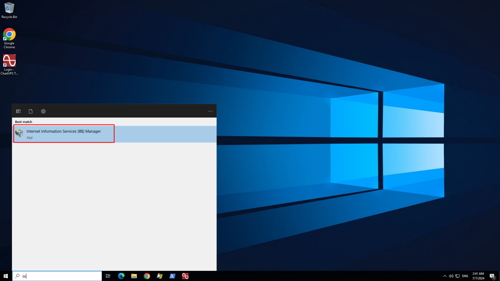 Type IIS in the Windows Search Bar then click on Internet Information Services (IIS) Manager