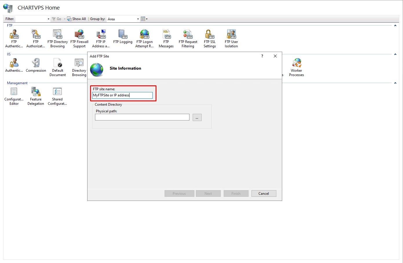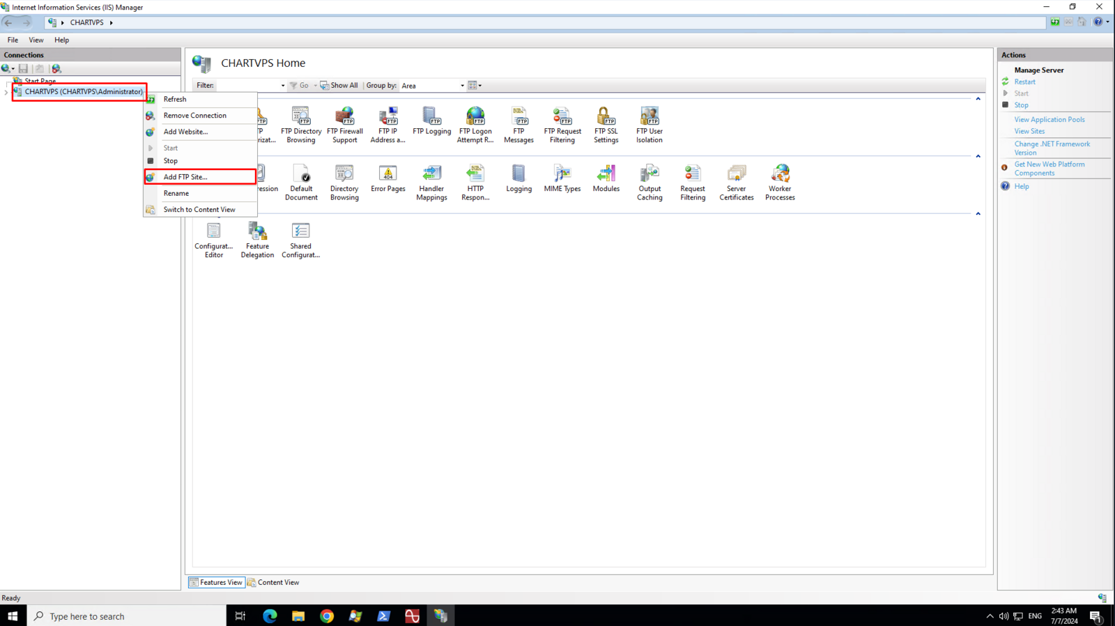 On the left pane of IIS Manager, Right Click on CHARTVPS (may vary depending on your machine name) and then click Add FTP Site context menu