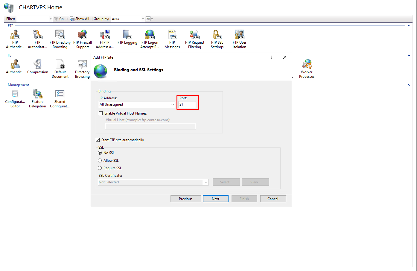 On the Binding and SSL Settings, you may customize your FTP port by changing the number in the Port text box. Make sure to take note of the number as you will have to configure your firewall to allow FTP connections on specific port.