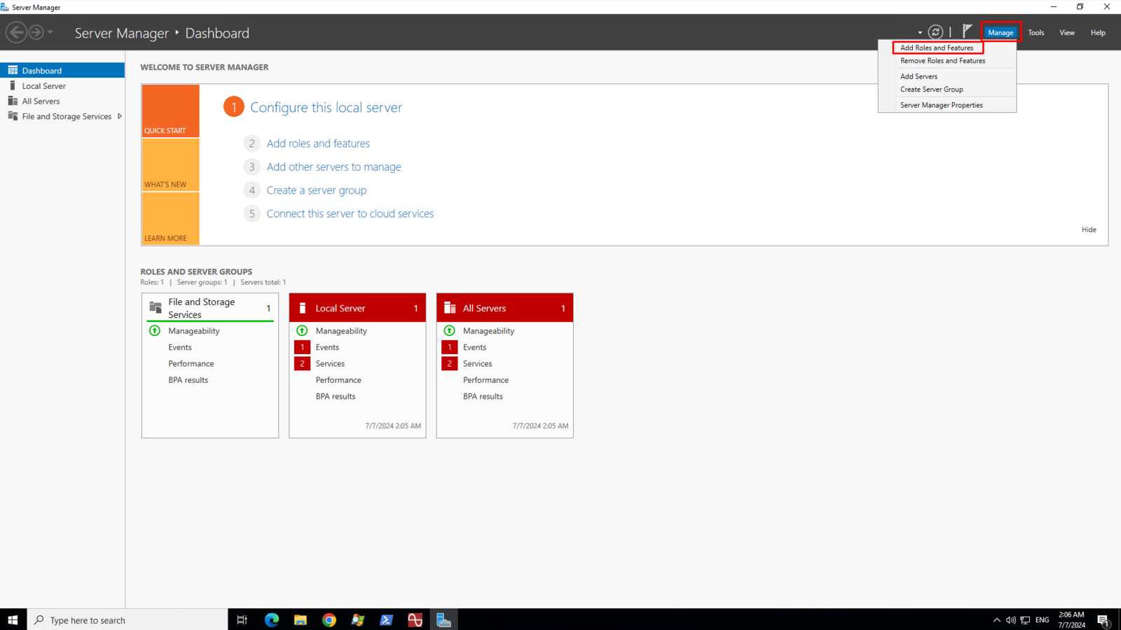 On the top right menu, click Manage and then click the Add Roles and Features sub menu