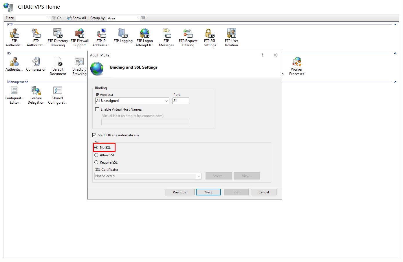 Select No SSL to proceed with the configuration. If you have your own SSL certificate, you can choose Require SSL option then click on the Select button to locate your SSL certificate.