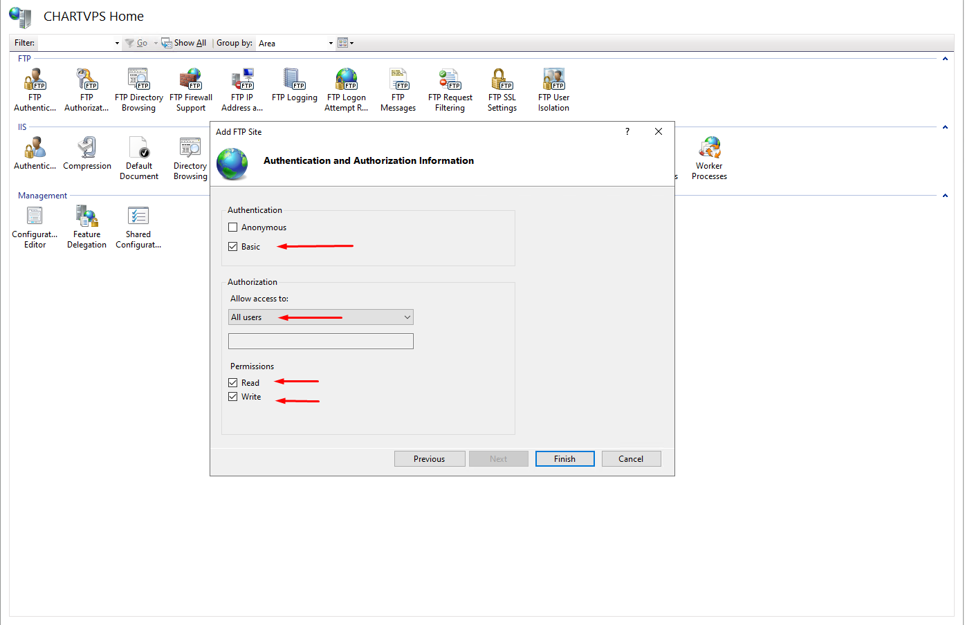 On the Authentication and Authorization Information page, click to select Basic authentication and select All Users under Allow access to drop down box. Click to check Read and Write boxes to allow users to download, upload, and delete files on your FTP site. Once everything is set, click the Finish button.
