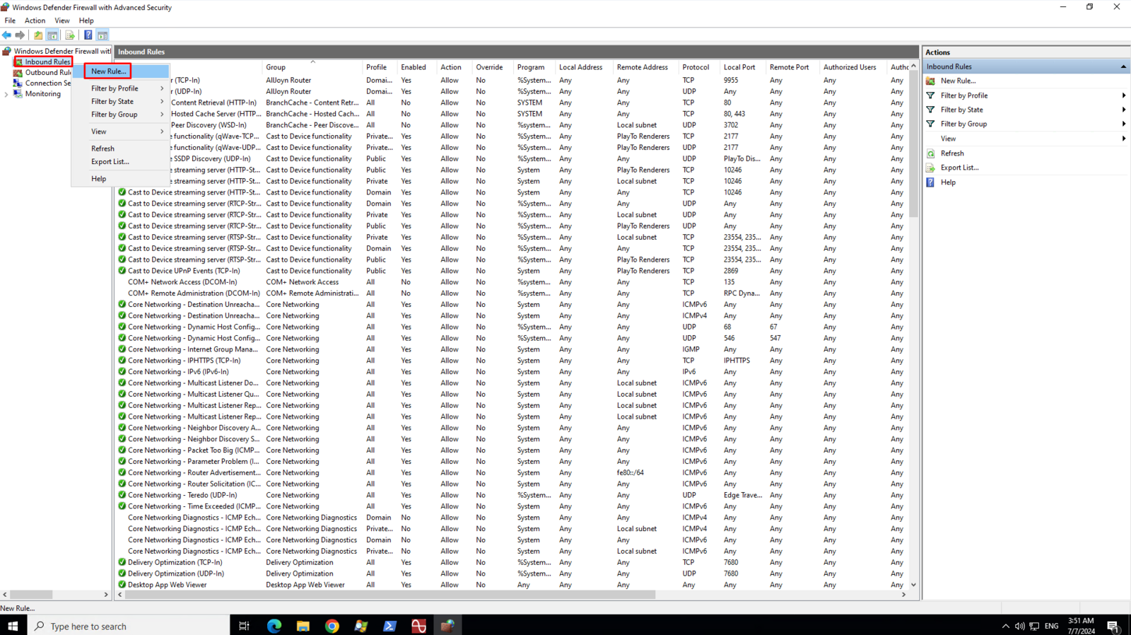 On the left pane, right-click on the Inbound Rules and then click New Rule