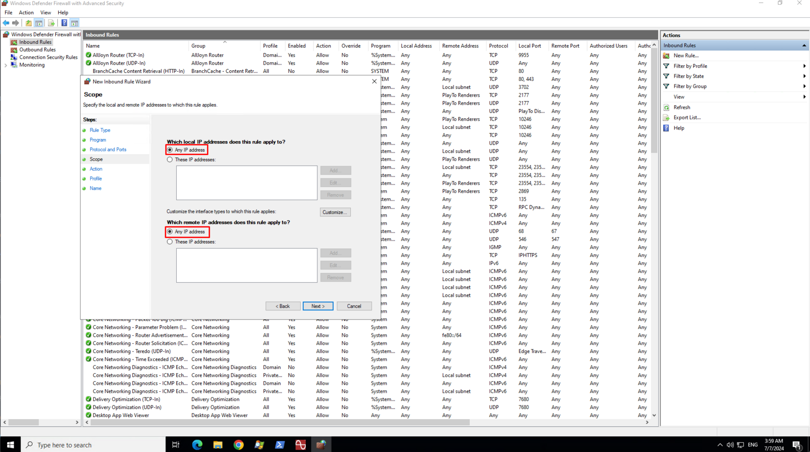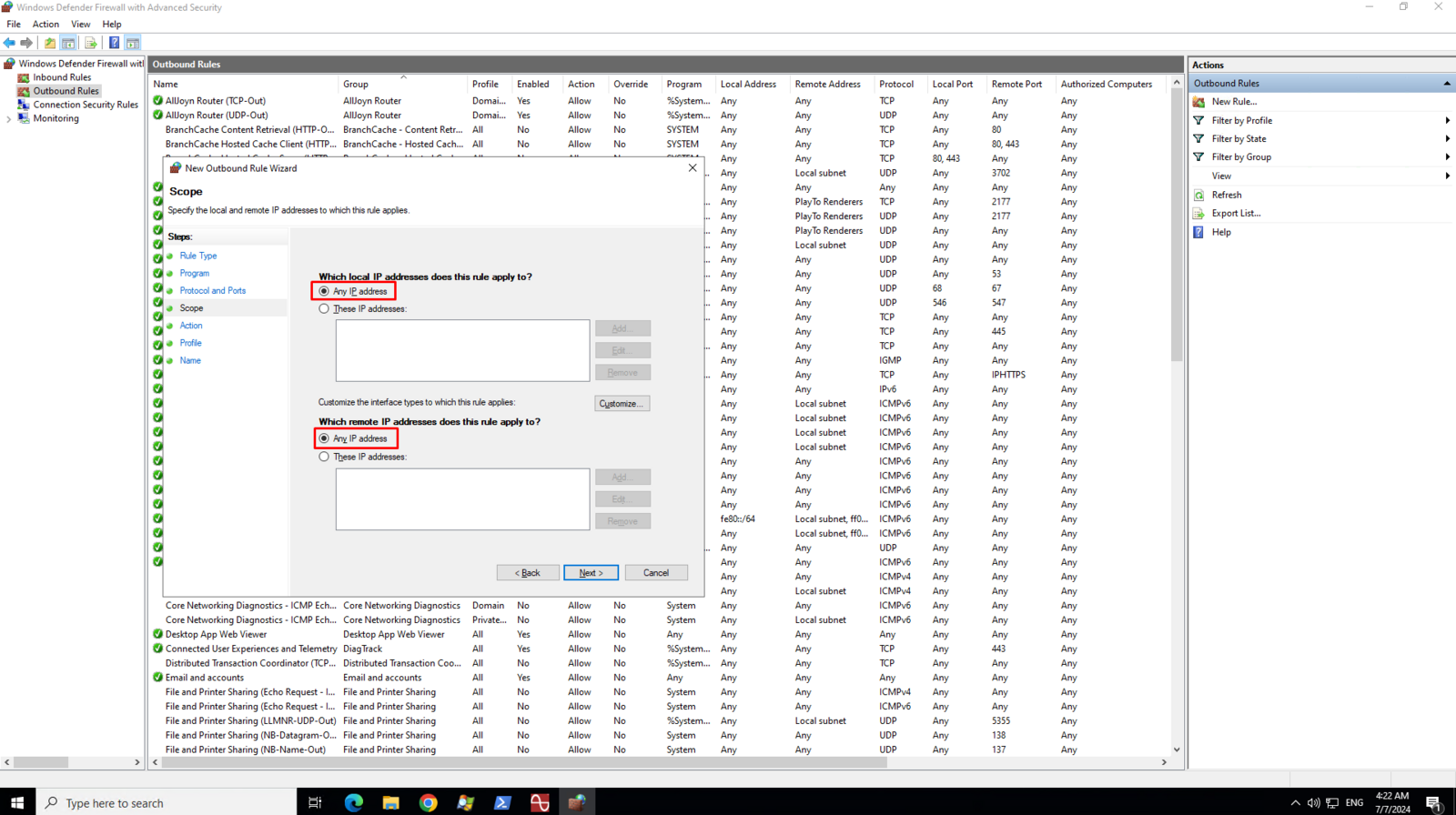 On the Scope page, select Any IP address for both local and remote ip addresses then click Next