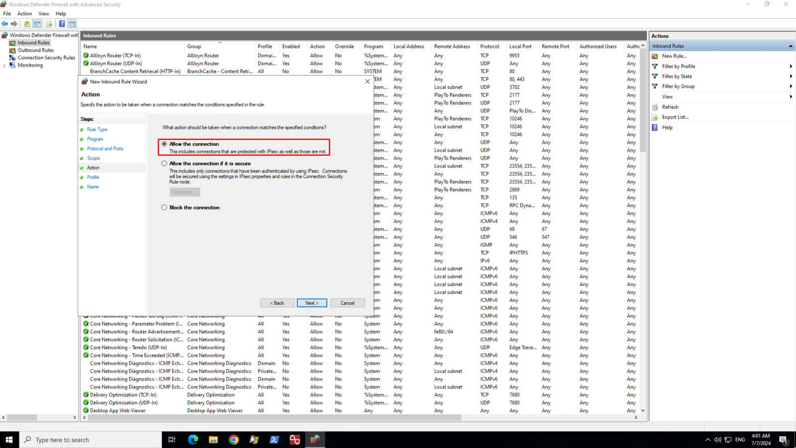 On the Action page, select Allow the connection then click Next